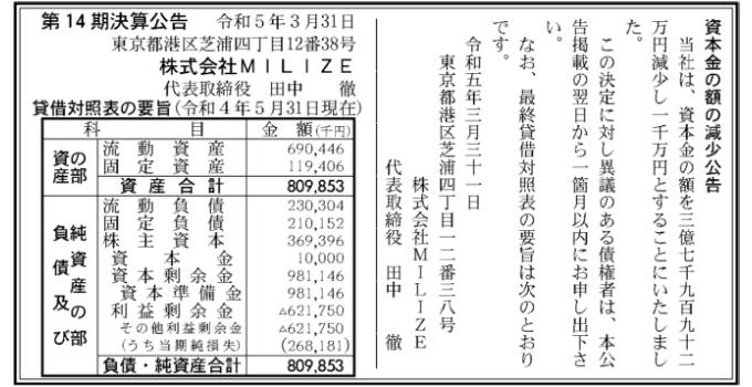 AI×金融工学 MILIZE、純利益△4.5億円→△2.6億円赤字縮小。2022年2月シリーズE総額6.8億円調達
