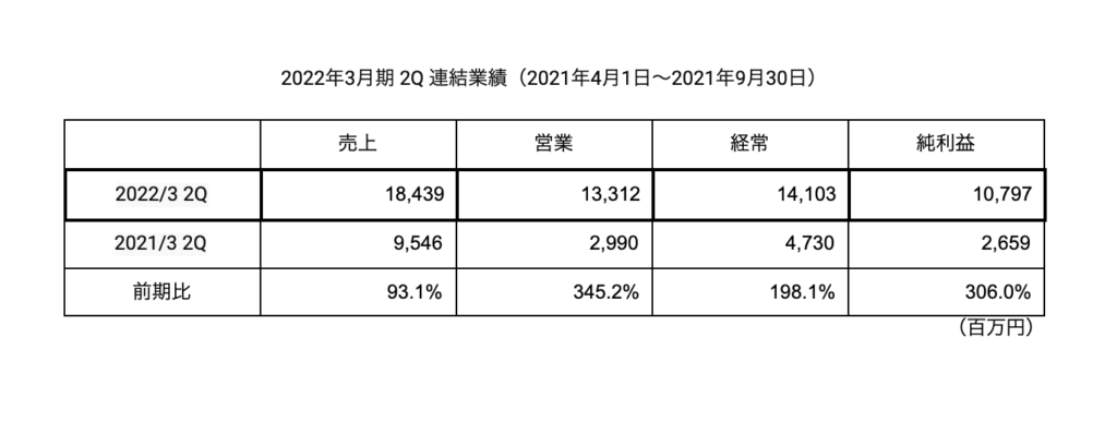 2Q(4/1-9/30)の資先新規IPOは国内2社、海外2社の計4社。キャピタルゲインは前期比190.4%増の107億2,100万円。管理報酬は前期比102.9%増の14億7,700万円、成功報酬が前期比282.5%増の34億8,800万円だった。
