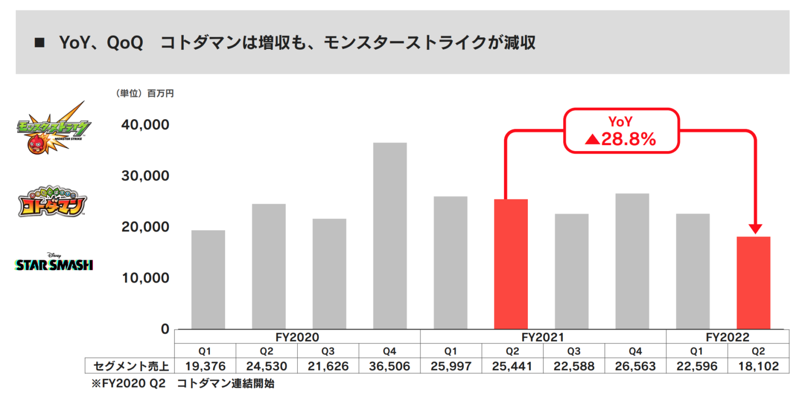 ミクシィ、2Q営業利益△47.5%減。主力スマホゲーム「モンスト」MAU低下、計画未達で減収減益 by TG News Editor 11/06/2021 ミクシィ<2121>が5日に発表した2022年3月期2Q連結の業績は、営業利益が前期比△47.5%減の73億8,200万円と振るわず、上期は減収、減益に終わった。稼ぎ頭のスマートデバイス向けゲーム「モンスターストライク」の月間アクティブユーザー(MAU)が低下し、減収。TVCMで認知向上、顧客層拡大を狙ったスポーツベッティングサービス「TIPSTAR」も計画が未達、コスト負担が想定を上回った。 Data Base 株式会社ミクシィ Tags #モバイルゲーム #業績