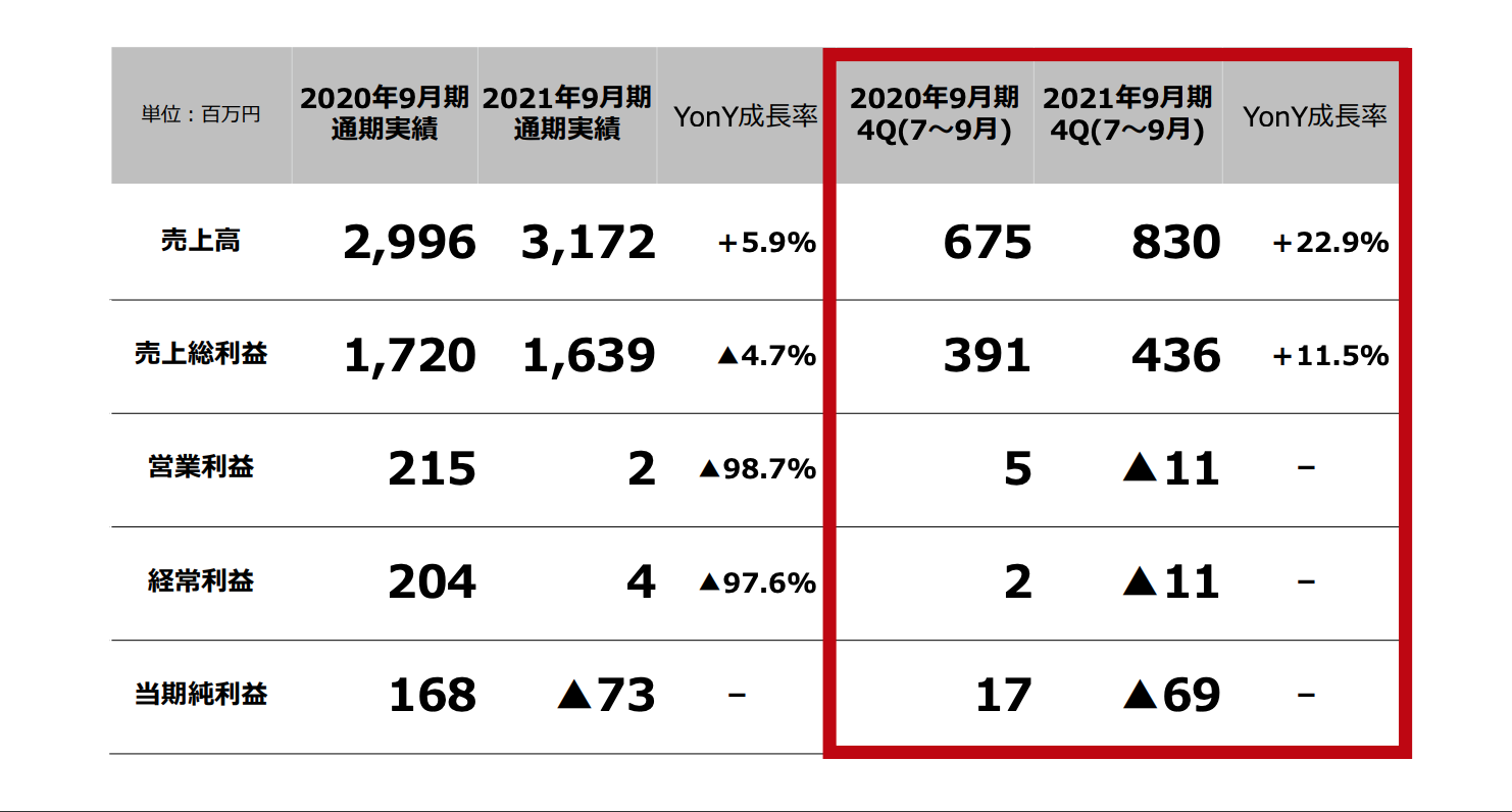 SNSマーケティングのサイバー・バズ、最終利益△7,300万円赤字転落。D2C事業への先行投資コストなど重荷 by TG News Editor 11/11/2021 SNSマーケティングのサイバー・バズ<7069>が10日に発表した2021年9月期 連結の業績は、最終利益が前期 1億6,800万円から△7,300万円の赤字へ転落した。主力の企業向けSNSマーケティング事業は概ね好調に推移したが、新規事業のD2C事業への先行投資コストなどが重荷となり、7-8月期の営業利益が△1,100万円の赤字に転落したほか、特別損失の発生が加わり最終損失が広がった。 Data Base 株式会社サイバー・バズ Tags #D2C #インフルエンサーマーケティング #業績