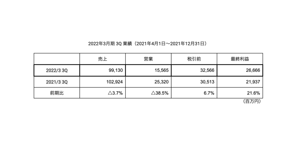 モバイルゲーム開発のディー・エヌ・エー<2432>が8日に発表した2022年3月期 3Q連結の営業利益は前年同期比△38.5%減の155億6,500万円だった。主力のゲーム事業が振るわなかった。今期の新規タイトルが2本に止まり、同売上収益が前期比18.1%減の560億円、セグメント利益は同41.4%減の85億3,100万円に落ち込んだ。スポーツ事業は、観客動員の制約などの新型コロナウイルス感染症対策があったものの、前年同期△14億9,500万円から△5億7,900万円の損失へ業績は回復傾向。また、タクシー配車アプリなど事業の移転損益 20億4,500万円やSHOWROOMの保有株式の売却益78億8,900万円などで投資利益は前期比1,032.4%増の130億9,800万円となった。