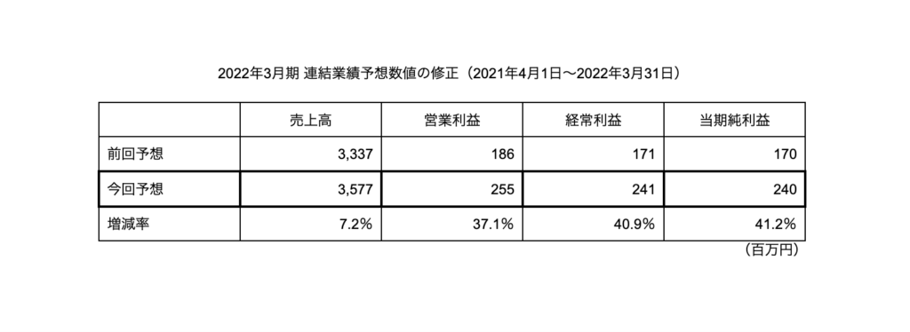 企業のDX(デジタルトランスフォーメーション)支援事業を展開するフレクト<4414>は10日、2022年3月期通期最終利益を前回予想から41.2%増の2億4,000万円へ上方修正した。企業のDX需要の高まりを受け、基盤事業のクラウドインテグレーショ ンサービスが好調に推移した。大手企業月次契約数が2021年12月末時点で前年同期22社から34社へ増え、大手企業の顧客基盤が拡大。顧客あたりの月次平均売上高 (ARPA)も 2021年12月末時点で 1,200万円(前年同期 850万円)となり業績拡大。売上、利益ともに前回発表の通期業績予想を上回る見込みとなった。