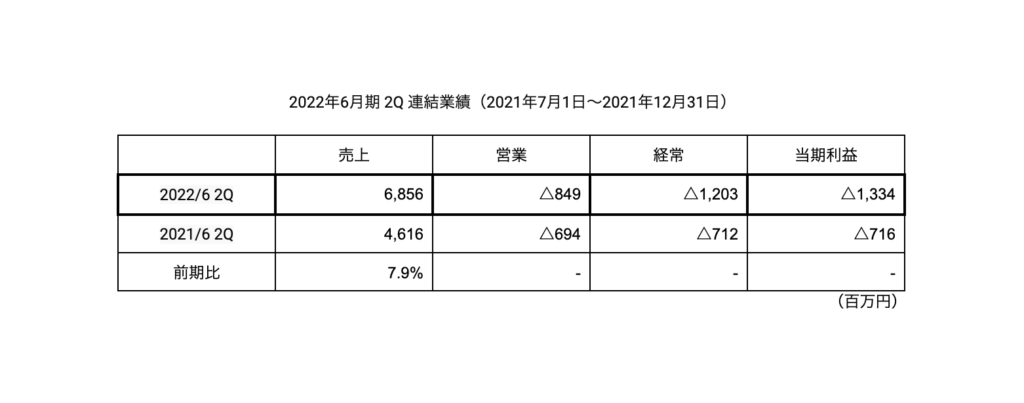 クラウド会計ソフト開発のフリー<4478>が14日に発表した2022年6月期 2Q 連結の業績は、最終損失が前年同期△7億1,600万円から△13億3,400万円へ赤字が拡大した。電子署名サービス事業の開発や顧客獲得の先行投資で赤字が続いている。加えて、2022年8月に予定している本社オフィス移転に伴い、減損損失1億3,200万円を計上。3Q以降において、期初業績予想から3億円前後の費用増加を見込んでいる。売上高は有料課金ユーザー企業数が前年同期24万5,003社から32万7,034社へ増加したことで、前期比48.5%増の68億5,600万円に拡大した。通期の業績予想は売上高143億6,100万円、調整後営業損失△24億6,100万円の赤字を見込んでいるが、手元資金は現預金約450億円と潤沢だ。