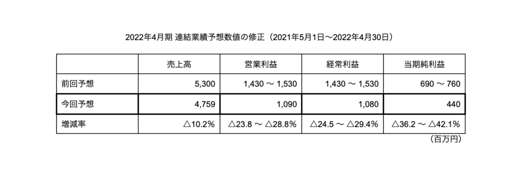 企業間取引のECサイト「スーパーデリバリー」などを展開するラクーンホールディングス<3031>は4日、2022年4月期の売上高を前回予想から10.2%減の47億5,900万円へ下方修正した。オミクロン株の感染拡大による第6波の影響により、消費マインドの停滞懸念が再燃し、売上成長が鈍化。売上高の伸びが想定を下回る見込みとなった。3Qは国内経済が Re-Opening となったことで、EC、フィナンシャル事業ともに売上成長。国内の購入客数、客単価がともに増加したが、原油価格の高騰やコンテナ不足、ウクライナ情勢など、今後、国際物流の混乱の影響が深刻化する可能性を踏まえて、通期業績予想を見直した。配当予想に修正はない。