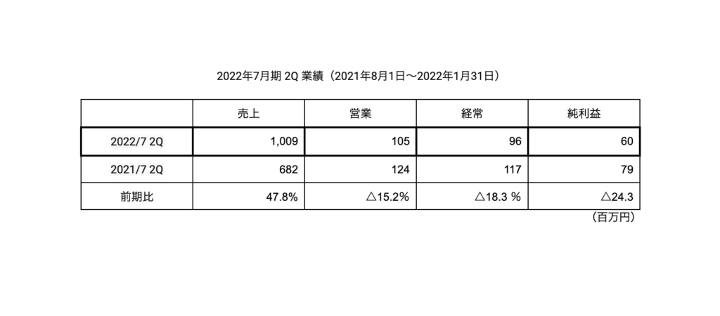 自社設計のサーバープラットフォームやアプリケーション開発などをワンストップで提供する Link-U<4446>が15日に発表した2022年7月期 2Q の業績は売上高が前期比47.8%増の10億900万円と伸長した。新規取引先との協業など、主力のマンガサービスの積み上げなどが収益力拡大につながった。連結子会社のリベラルマーケティングも人員拡充、広告に注力し、受注件数が伸びたほか、芳文社との協業「COMIC FUZ」など複数サービスの初期開発や保守開発サービスを手掛け、売上が拡大した。一方、利益は減益。海賊版サイトや人材採用などの先行投資が影響した。
