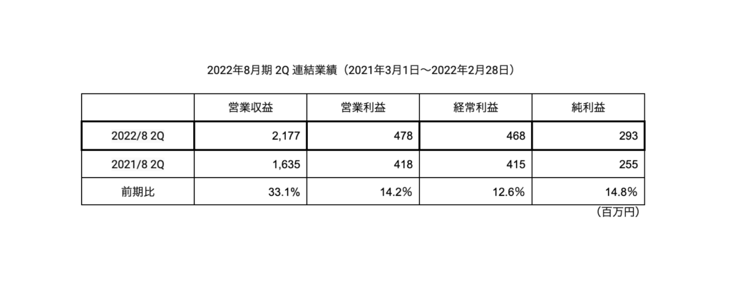 ビジネスSNSプラットフォーム「Wantedly」運営のウォンテッドリー<3991>が14日に発表した2022年8月期2Q連結業績は営業収益が前年同期比33.1%増の21億7,700万円と好調に推移し、増収増益だった。主力プロダクト「Wantedly Visit」の継続的な開発、改善を図り、新規登録企業が増加した。2022年2月末時点、ビジネスSNSプラットフォーム「Wantedly」は登録企業4.2万社、登録個人ユーザ数は339万人だった。通期業績も前回予想を上回る見通し。営業収益は43億5,000万円から44億5,000万円へ、 営業利益を6億円から11億円へそれぞれ上方修正した。