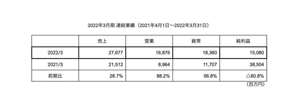 ベンチャーキャピタル大手ジャフコグループ<8595>が22日に発表した2022年3月期の業績は営業利益が前期比88.2%増の168億7,600万円だった。4月に上場したビジョナルの大型IPOなどによる株式売却で上場キャピタルゲインは対前期比で増加し、成功報酬も大幅に増加。売上高、営業利益、経常利益が拡大した。ビジョナルの株式売却に伴うキャピタルゲインと成功報酬は計114億円に及んだ。一方、上場以外のキャピタルゲインは減少した。