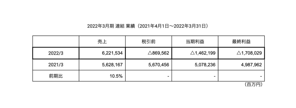 ソフトバンクグループが12日に発表した2022年3月期の連結業績は最終利益が△1兆7,080億2,900万円の大幅赤字に転落した。前年同期は4兆9,879億6,200万円の黒字だった。