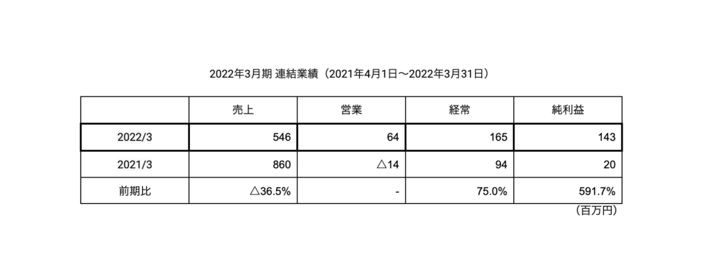 フューチャーベンチャーキャピタル<84620>が12日に発表した2022年3月期連結業績は最終利益が前期比591.7%増の1億4,300万円となり、過去最高益だった。保有株式売却やIPOによる成功報酬がなく、売上高は前期比△36.5%減の5億4,600万円と減収だったが、新規ファンド設立や既存ファンドからの追加出資などファンドの管理報酬を中心とした安定的収入が増加したほか、固定費減少などにより営業利益が前期△1,400万円の赤字から6,400万円へ黒字転換。エクイティ投資におけるノウハウを定額で提供する独自の長期安定収益体制を構築したことで、投資企業の新規上場によるキャピタルゲインや成功報酬に依存しないビジネスモデル形成が奏功した。
