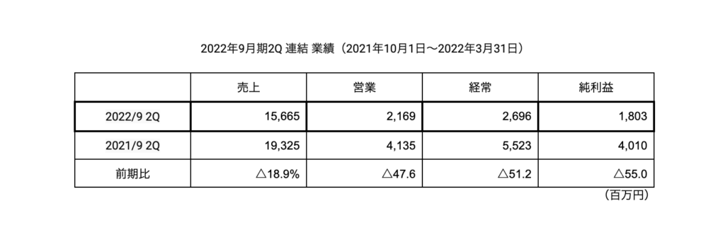 スマホゲーム開発のコロプラ、2Q最終利益△55%減。売上連動の決済手数料や広告宣伝費など増加 by TG News Editor 05/14/2022 スマートフォン向けゲーム開発、運営を行うコロプラ<3668>が11日に発表した2022年9月期2Q連結の業績は、最終利益が前年同期比△55.0%減の18億300万円で着地した。主力のスマートフォン向けゲームは、他社IPタイトル 「ドラゴンクエストウォーク」や自社IPタイトル「クイズRPG 魔法使いと黒猫のウィズ」などの既存タイトルが堅調に推移し、QoQでは成長したものの、前年同期比で減収、減益となり、売上連動の決済手数料や広告宣伝費などの増加で利益を圧迫した。 Data Base コロプラ Tags #モバイルゲーム #業績