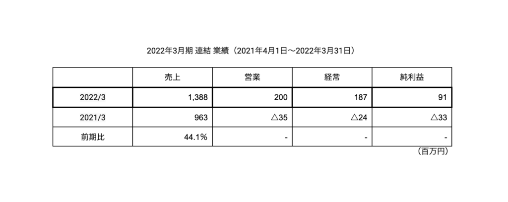 SNSマーケティングのラバブルマーケティンググループ<9254>が12日に発表した2022年3月期連結業績は売上高が44.1%増の13億8,800万円と成長し、過去最高を記録した。主力のSNSマーケティング事業が好調で、新規運用案件の受注が伸長し、 SaaS型のSNS運用支援ツールの導入件数が拡大したほか、マーケティング オートメーション事業の新規受注件数、受注単価が増加した。売上高の増加が人材投資などを上回り、営業利益は前期△3,500万円赤字から一転、2億円へ黒字転換した。2023年3月期の業績予想は売上高17億4,200万円、営業利益2億500万円、経常利益2億100万円、純利益1億2,200万円の見通し。