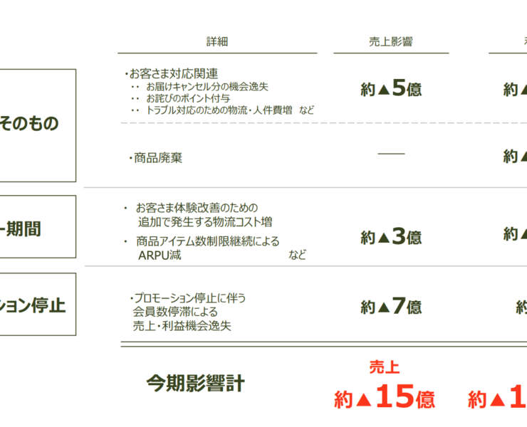 オイシックス、営業利益30%減へ下方修正。新物流センター移転トラブルでキャンセル8万人。影響は利益ベース△15-20億円