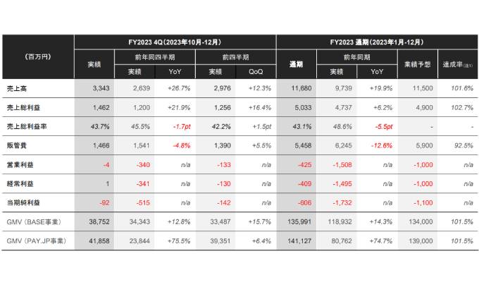 無料ネットショップ BASE、2Q純損失△9.2億円→△3.7億円へ赤字減少。現預金217億円。25年営業損益黒字化目指す