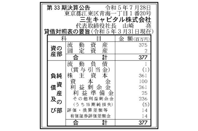 生保系VC 三生キャピタル、23年3月期純利益6,600万円→△500万円赤字転落。投資企業500社超。22年12月新規投資を停止