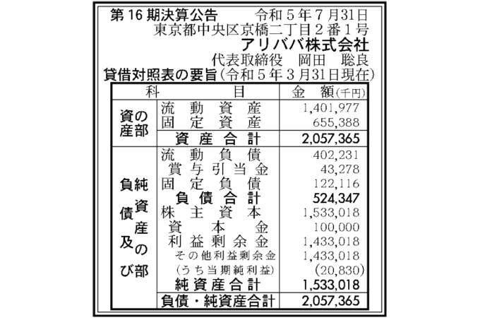 中国アリババグループ日本法人 アリババ、23年3月期純利益 1億円→2,083万円へ減少。利益剰余金14.3億円